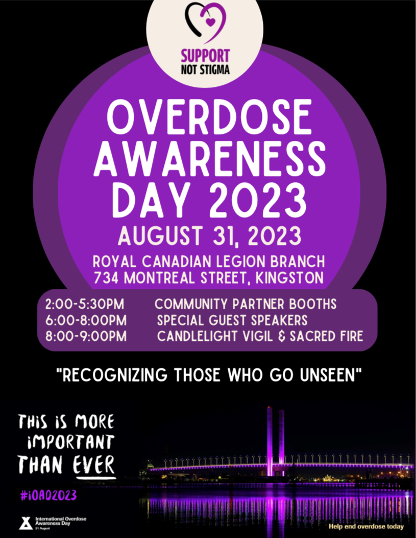 On August 31, 2023, representatives from Moms Stop the Harm, the Support Not Stigma initiative, and Kingston, Frontenac, Lennox & Addington (KFL&A) community partners, are commemorating International Overdose Awareness Day with an event at the Royal Canadian Legion Branch 560, 734 Montreal Street, Kingston.